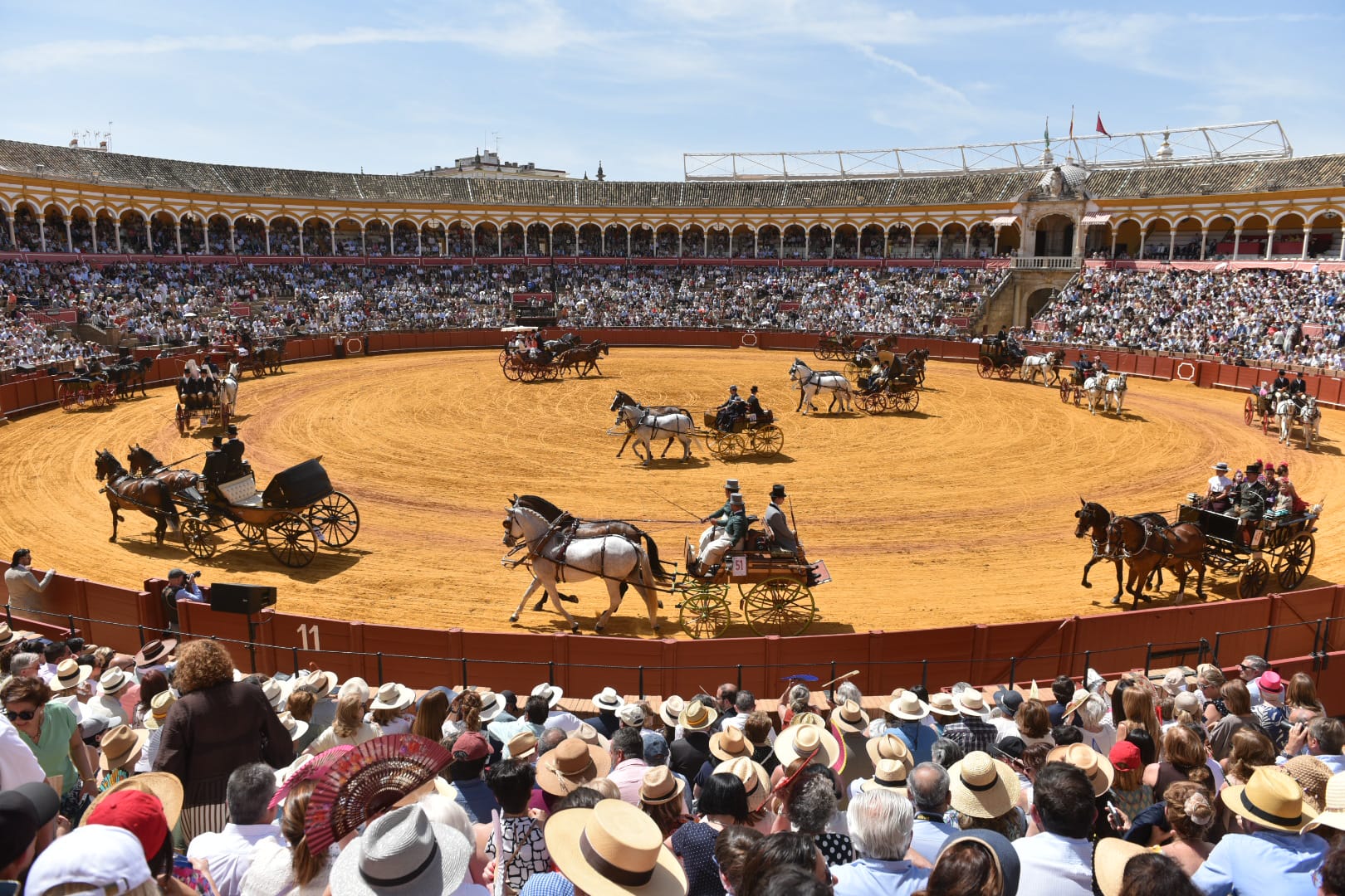 Las distintas tandas de carruajes reflejaron el altonivel de esta edición, tanto por la calidad de los coches como por la cuidada presentación de caballos y guarniciones. Sobre el ruedo también destacó el protagonismo de la indumentaria tradicional, con 56 señoras ataviadas con mantilla y 88 vestidas de flamenca. En el albero se dieron cita 323 caballos —269 de Pura Raza Española— en una completa representación de modalidades: ponys, mular, limoneras, troncos, tándem, tresillos, potencias, cuartas, medias potencias, cinco a la larga y coach. La procedencia de estos carruajes fue de Portugal, Italia y distintos puntos de España.